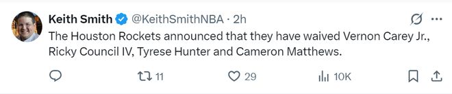 火箭裁掉四名球员,回归14+3的阵容。全队一