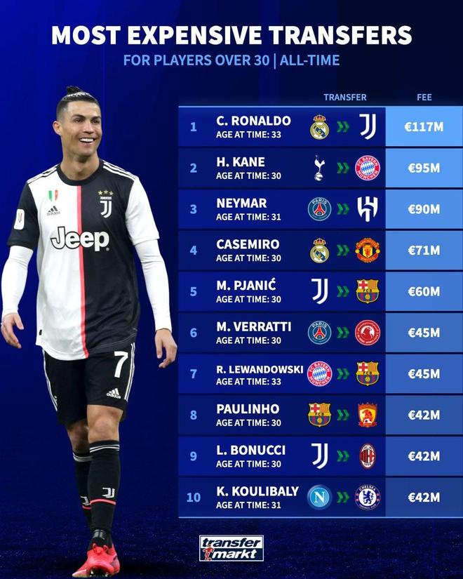 德国转会统计:30岁以上球员转会费排行榜:C罗